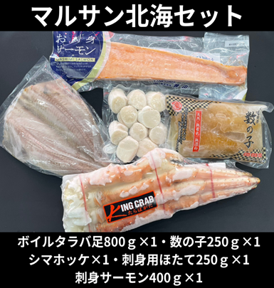 (セット内容) タラバ足800g前後×1・刺身サーモン400g×1・味付き数の子(白醤油)250g×1・刺身用ほたて貝柱250g×1・シマホッケ450g×1